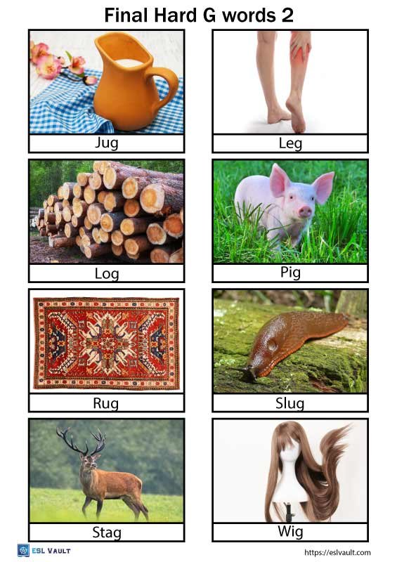 Here are some free resources for teaching and learning about hard G words in the English language. They arere are hard G sound words, lists, and pictures that you can use in all sorts of ways to teach the sound /g/. These materials not only serve to teach pronunciation but also vocabulary in general.