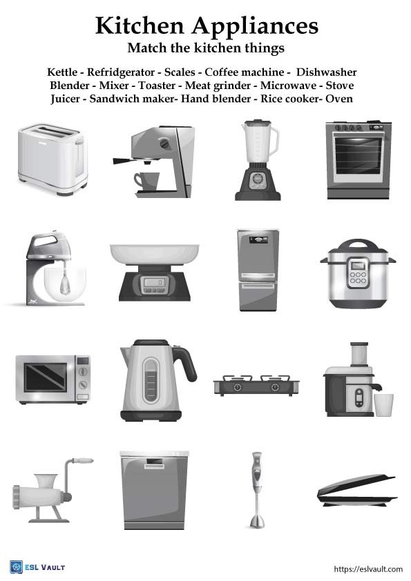 A vocabulary matching exercise of 16 common appliances found in the kitchen. The answers reading from left to right are – toaster, coffee machine, blender, oven, mixer, scales, refrigerator, rice cooker, microwave, kettle, stove, juicer, meat grinder, dishwasher, hand blender, and sandwich maker.